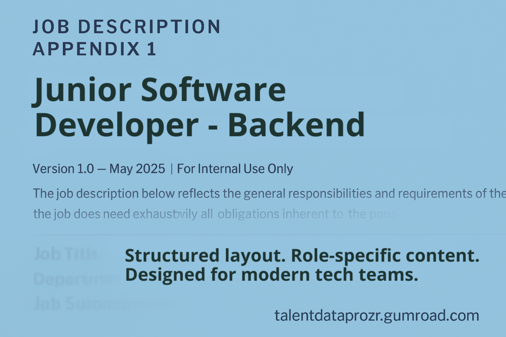 A professionally written, ready-to-use job description for Junior Backend Developer roles. Includes structured layout, editable content, and guidance to help recruiters and hiring managers attract the right talent in tech teams.